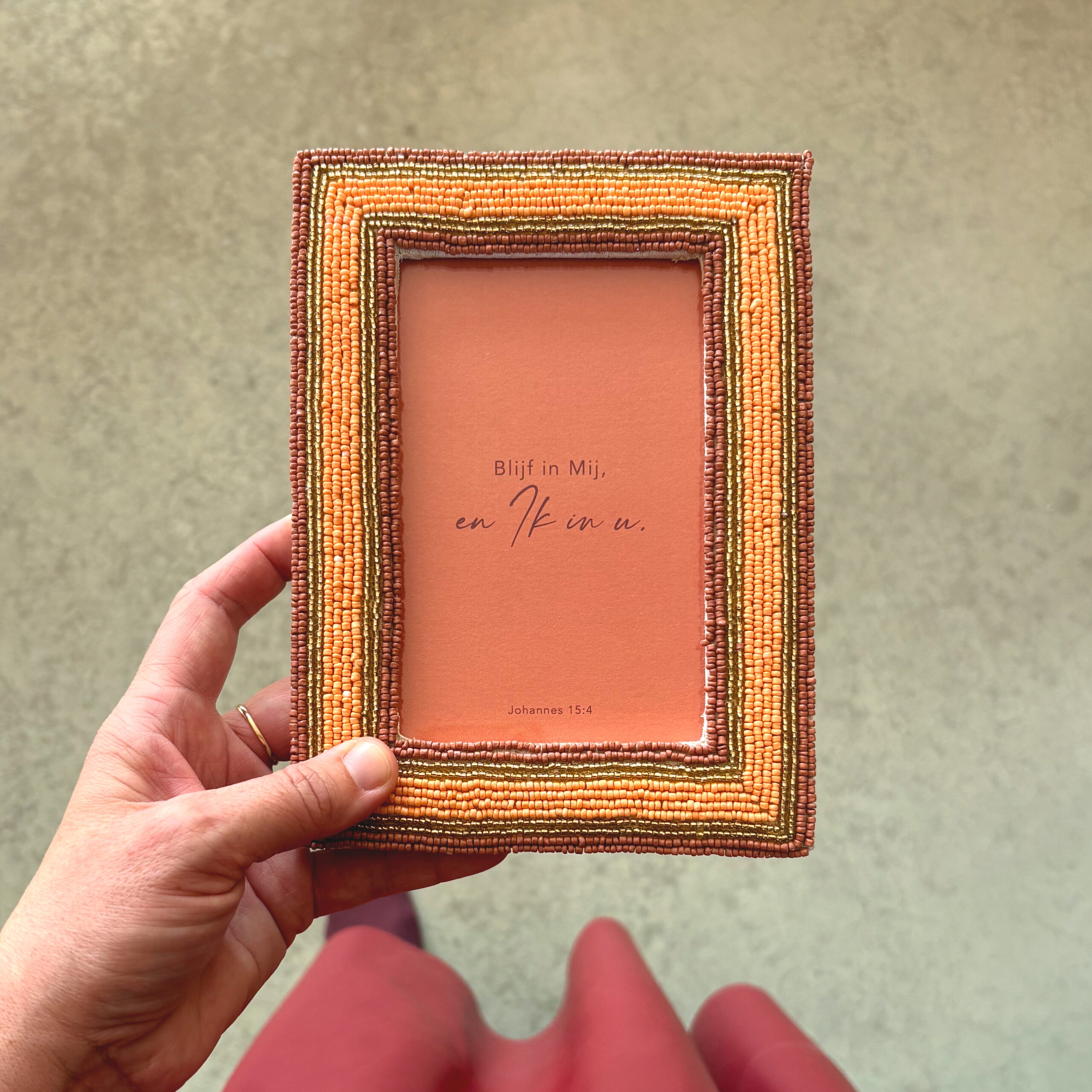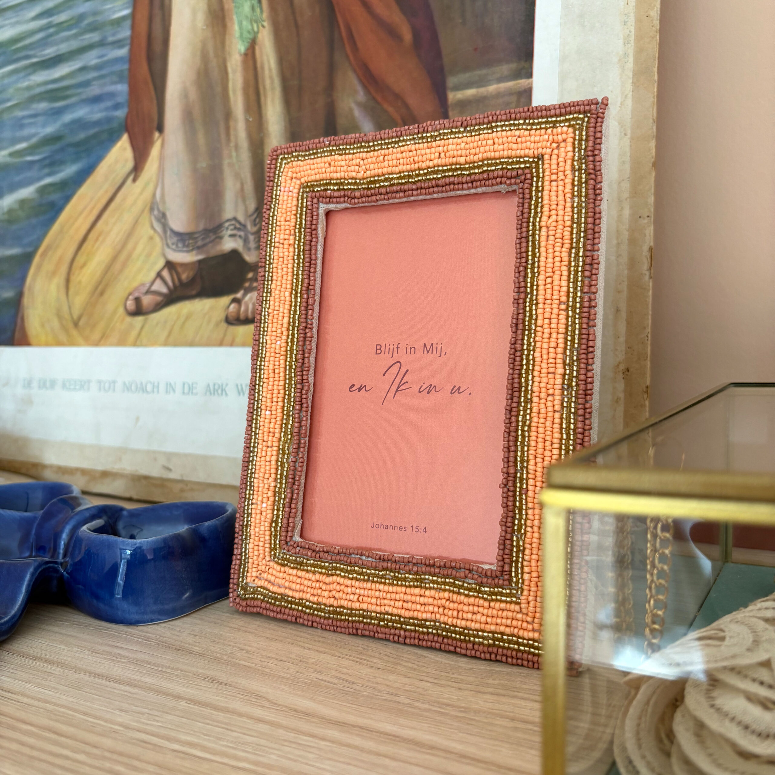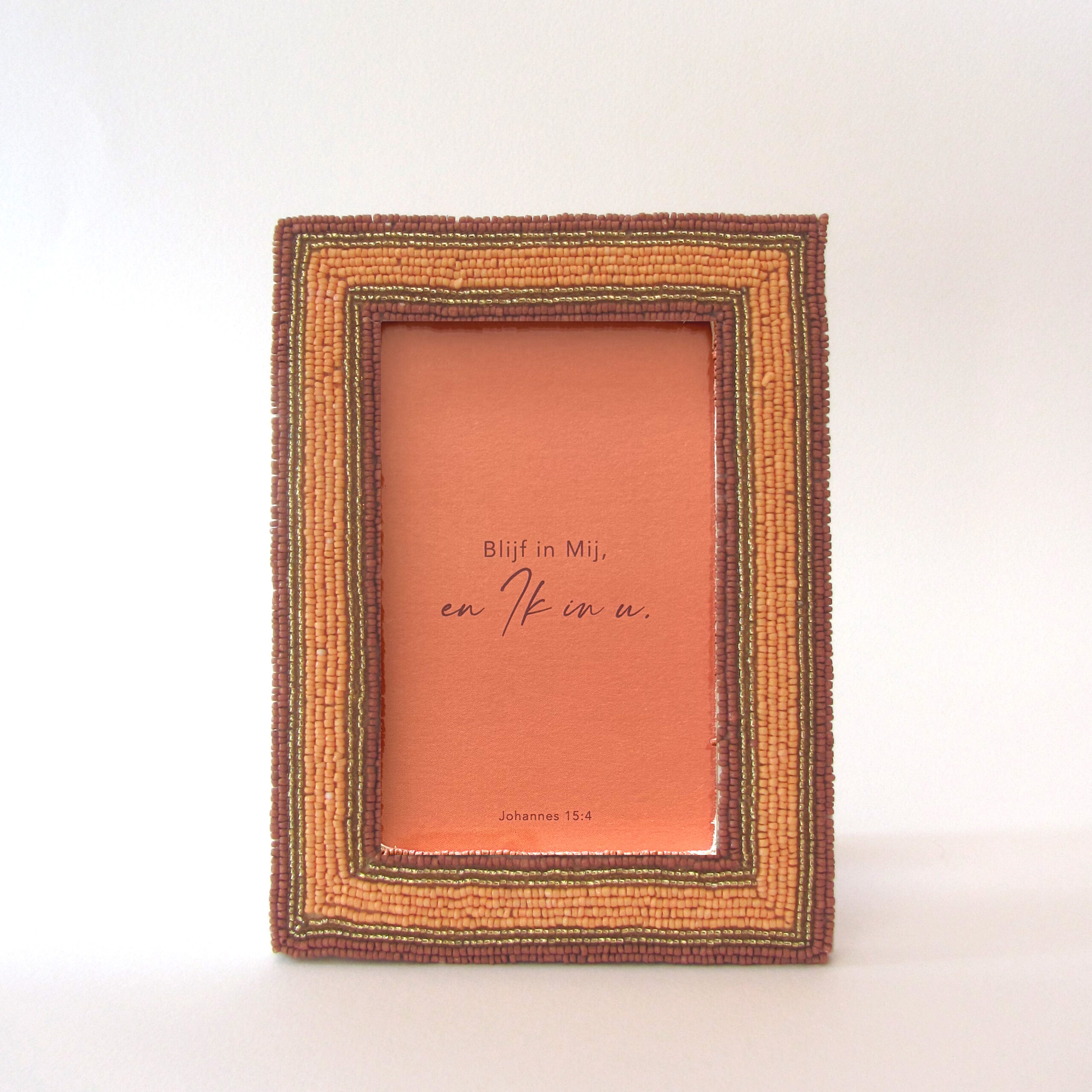 - Handgemaakte fotolijst met kralen in de kleuren zalmroze, goud en oudroze